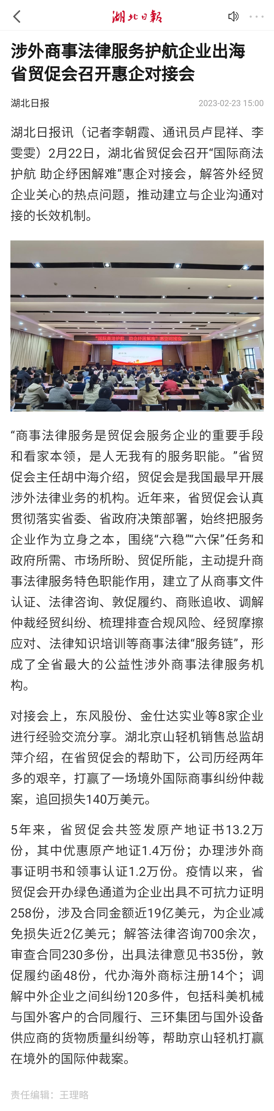 湖北日报:涉外商事法律服务护航企业出海 省贸促会召开惠企对接会