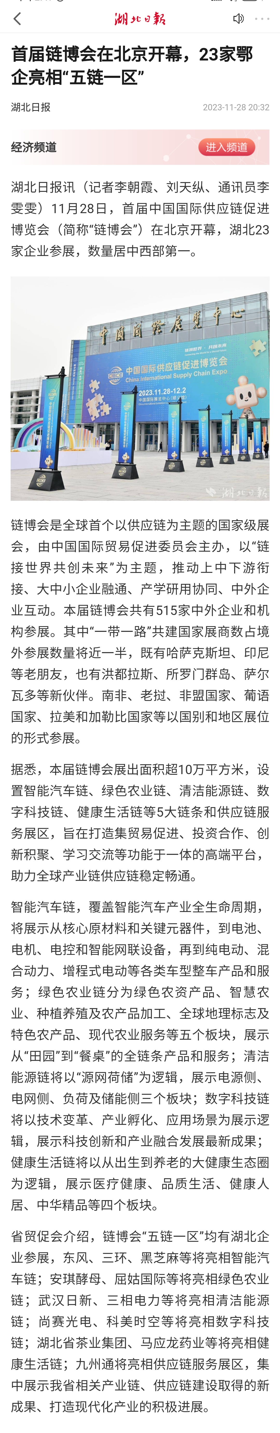 湖北日报:首届链博会在北京开幕,23家鄂企亮相“五链一区”