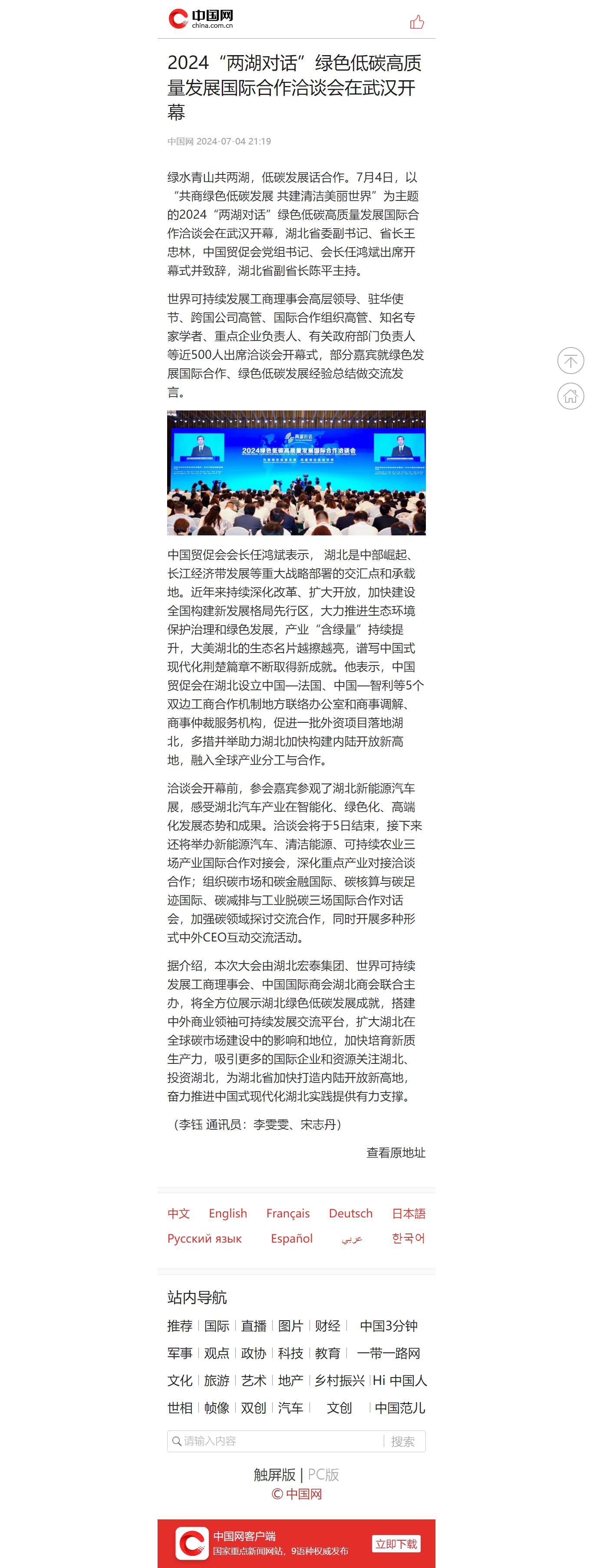 中国网:2024“两湖对话”绿色低碳高质量发展国际合作洽谈会在武汉开幕