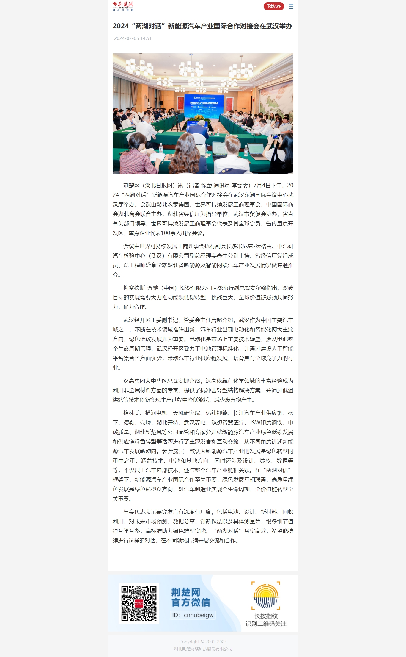 荆楚网:2024“两湖对话”新能源汽车产业国际合作对接会在武汉举办