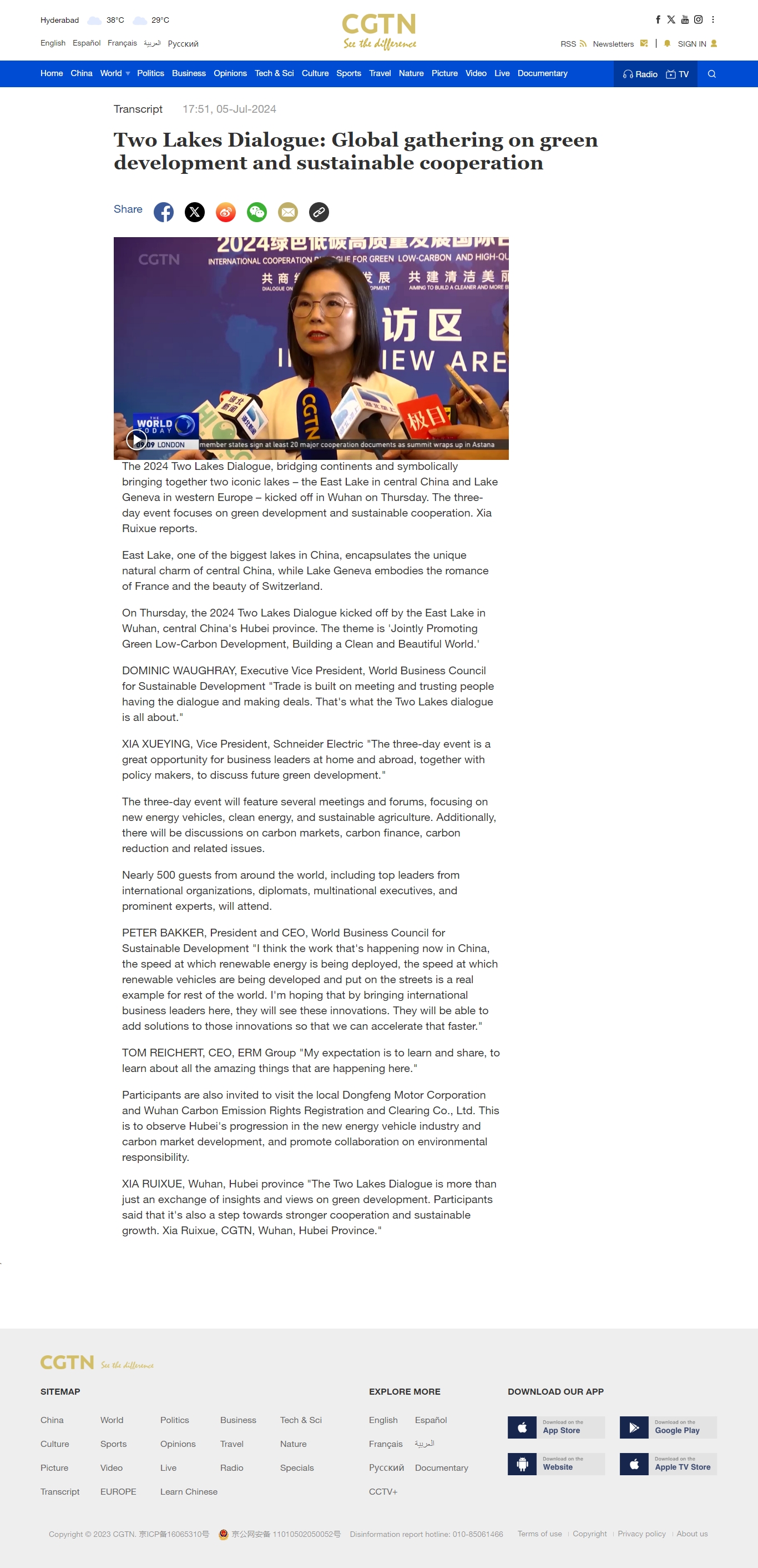 中央电视台CGTN:Two Lakes Dialogue Global gathering on green development and sustainable cooperation