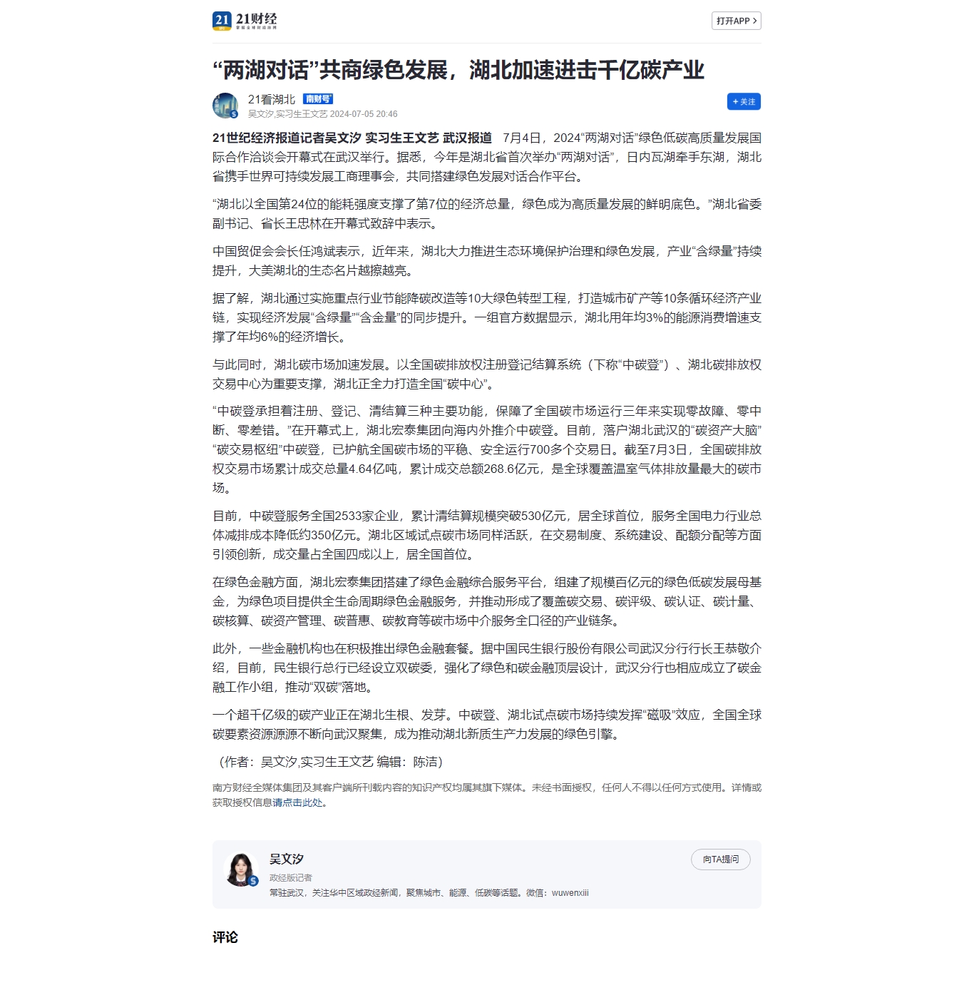 21财经:“两湖对话”共商绿色发展,湖北加速进击千亿碳产业