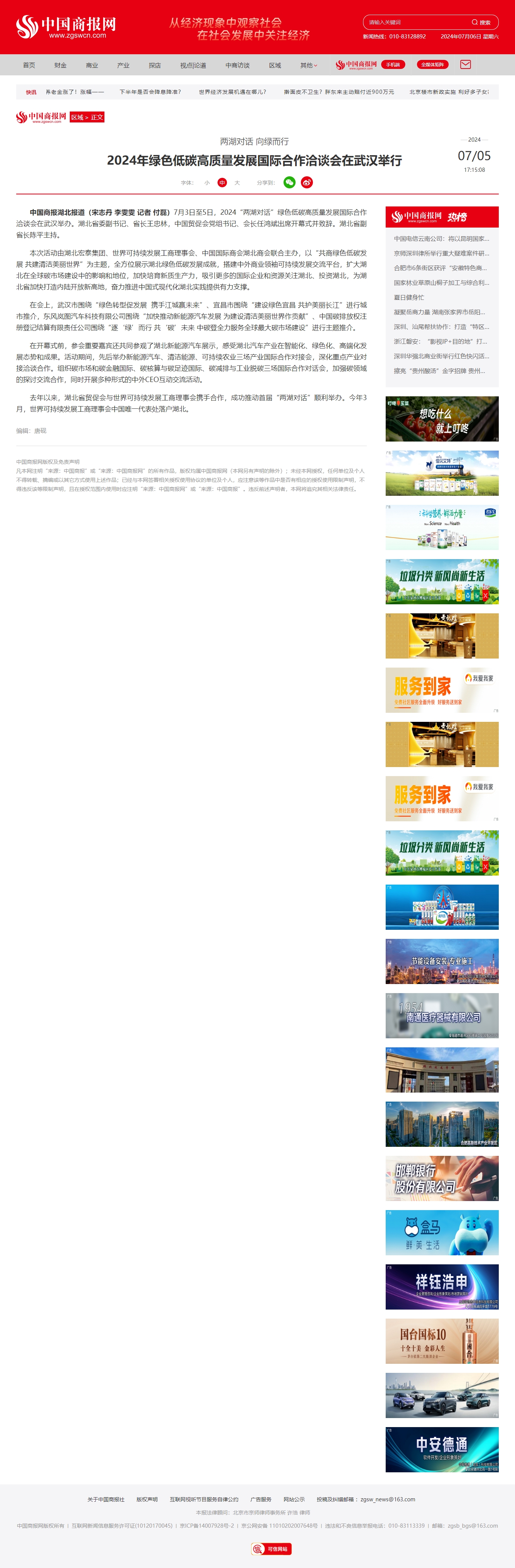 中国商报:两湖对话 向绿而行 2024年绿色低碳高质量发展国际合作洽谈会在武汉举行