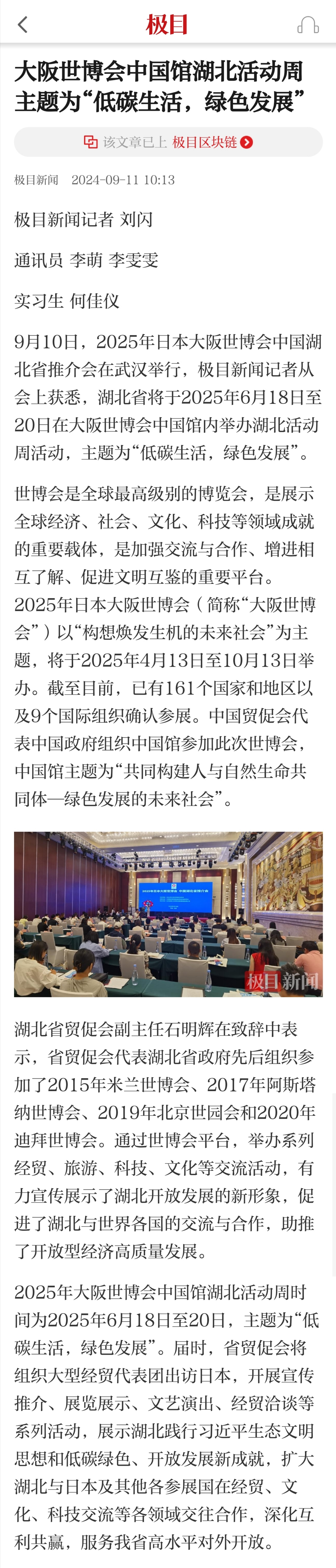 极目新闻:大阪世博会中国馆湖北活动周主题为“低碳生活,绿色发展”