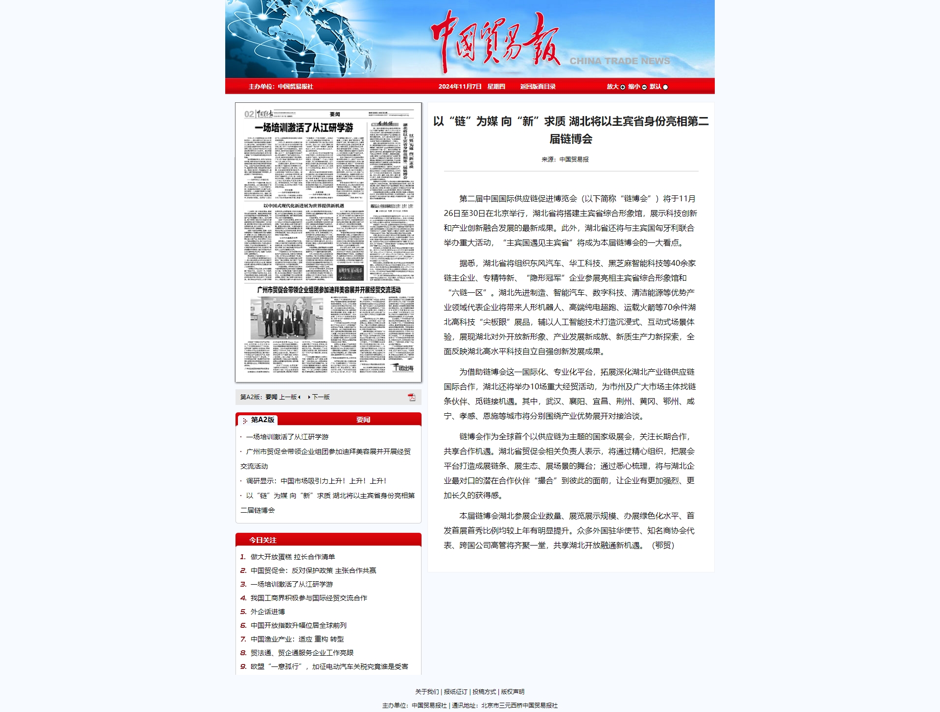 中国贸易报:以“链”为媒 向“新”求质 湖北将以主宾省身份亮相第二届链博会