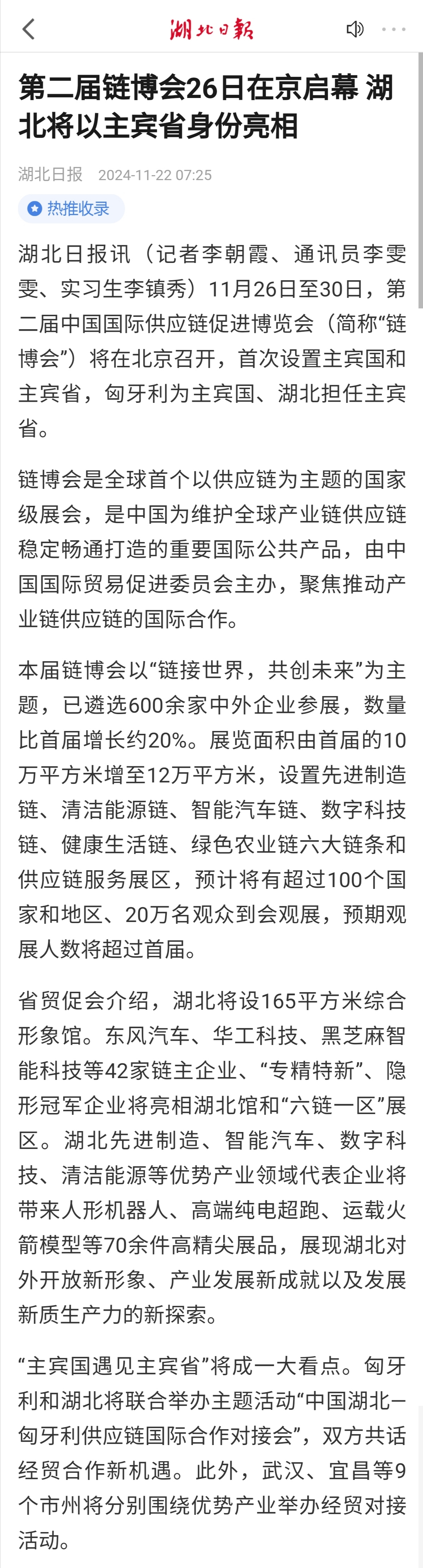 湖北日报:第二届链博会26日在京启幕 湖北将以主宾省身份亮相