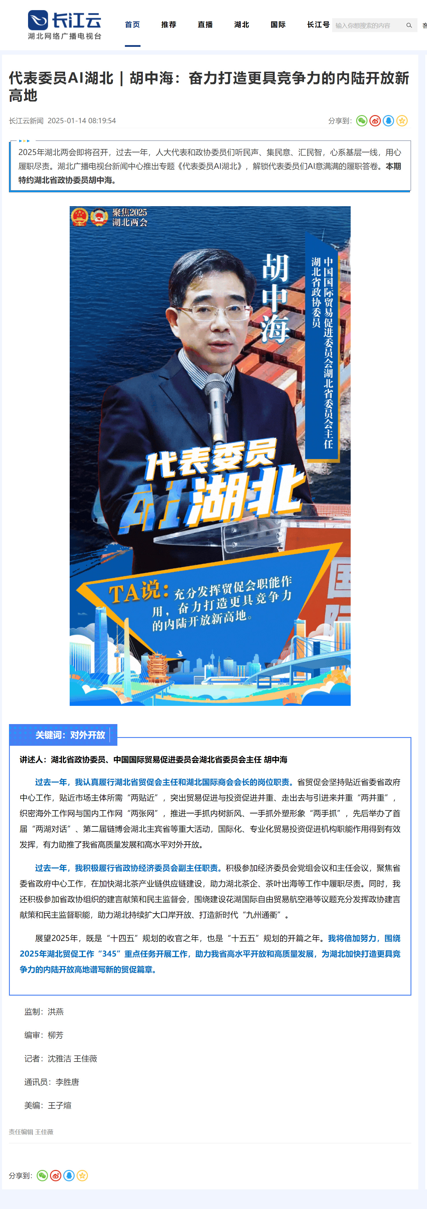 长江云:代表委员AI湖北 | 胡中海:奋力打造更具竞争力的内陆开放新高地