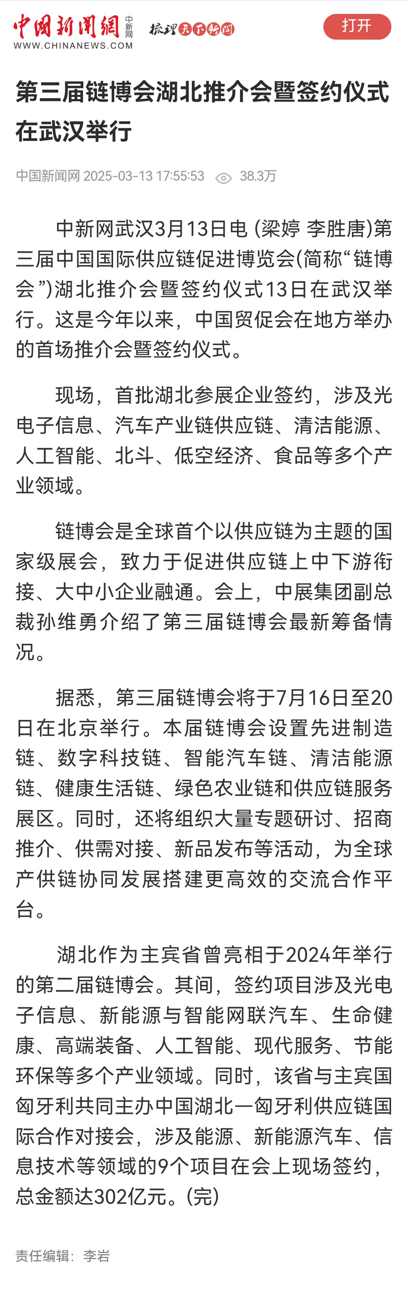 中国新闻网:第三届链博会湖北推介会暨签约仪式在武汉举行