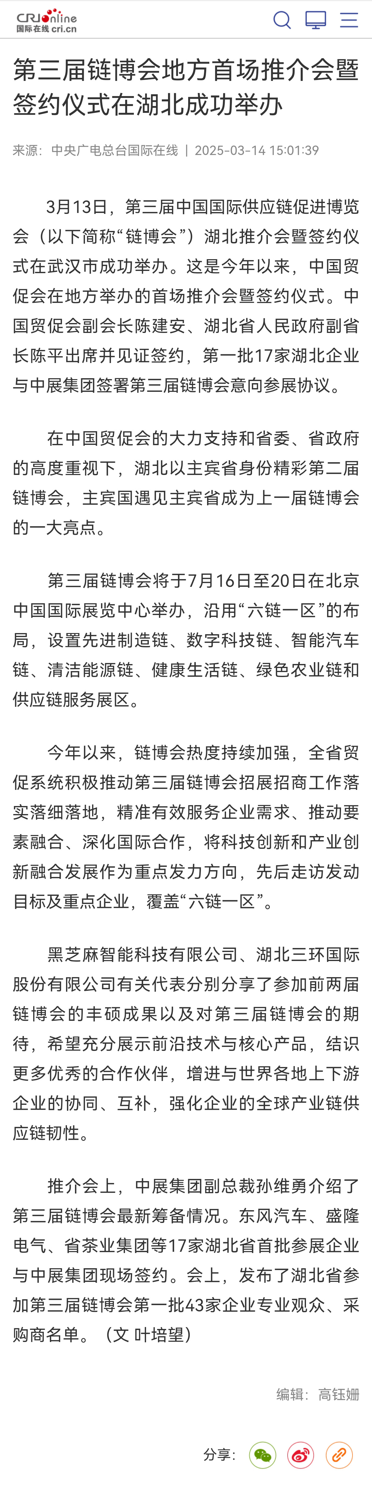 国际在线:第三届链博会地方首场推介会暨签约仪式在湖北成功举行