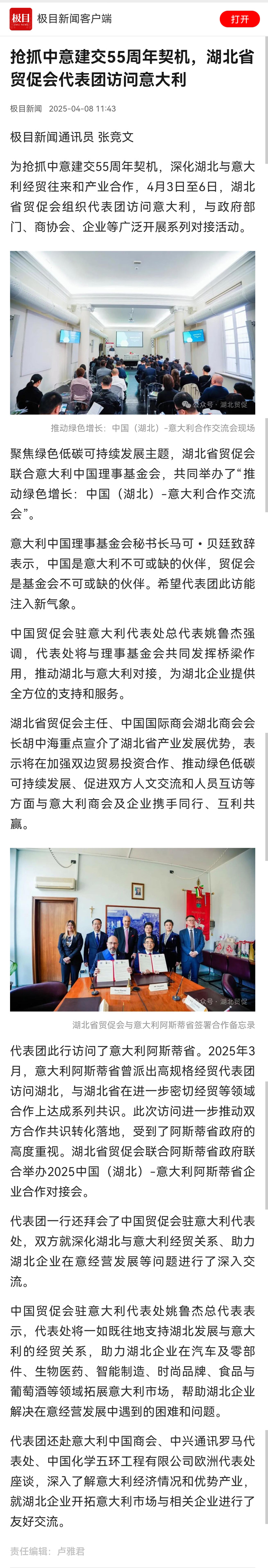 极目新闻:抢抓中意建交55周年契机,湖北省贸促会代表团访问意大利