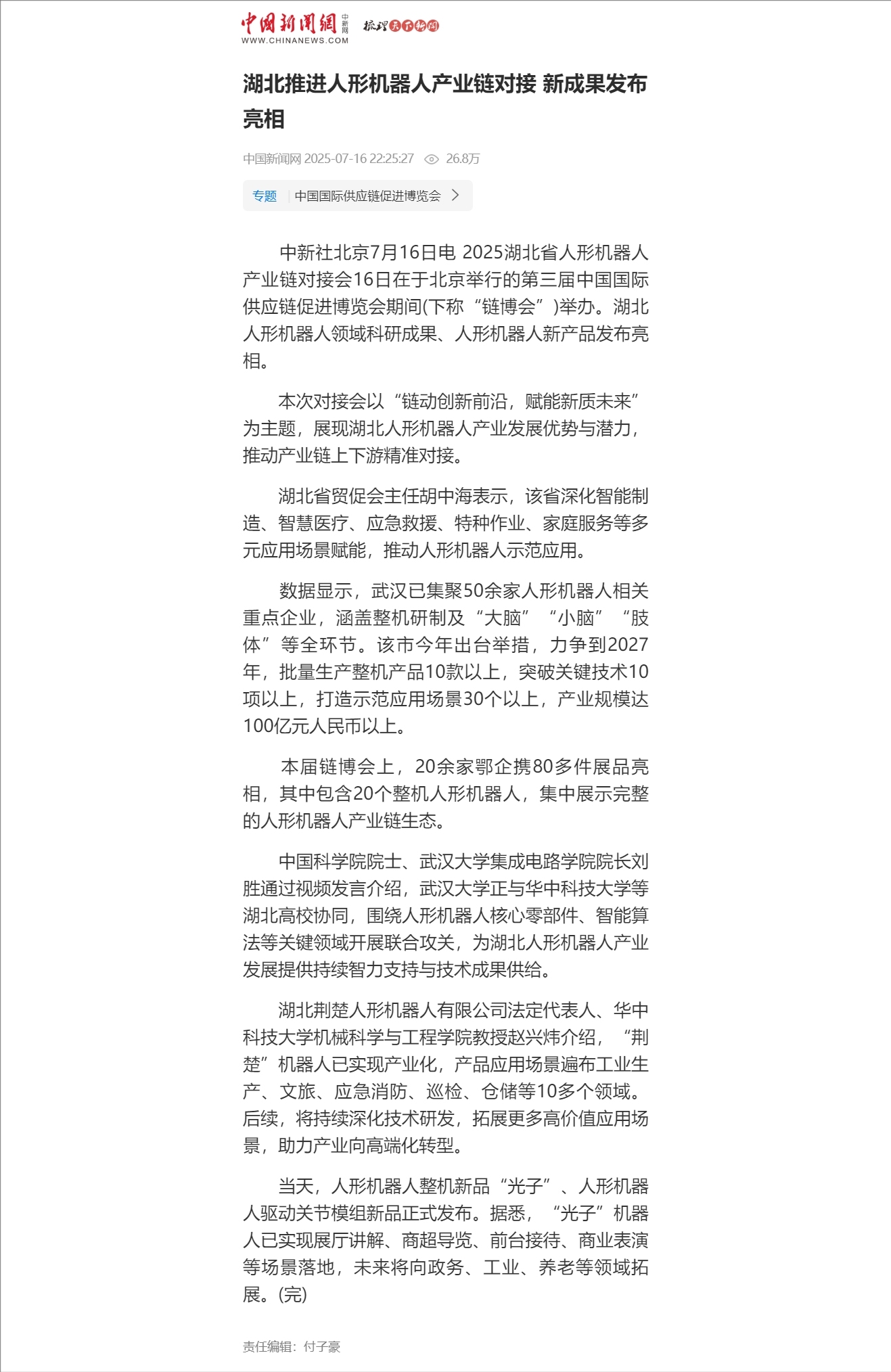 中新社:湖北推进人形机器人产业链对接 新成果发布亮相