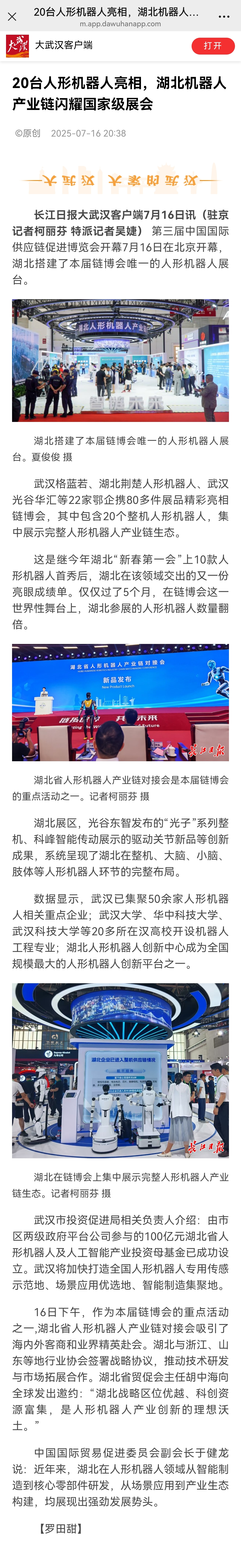 长江日报:20台人形机器人亮相,湖北机器人产业链闪耀国家级展会