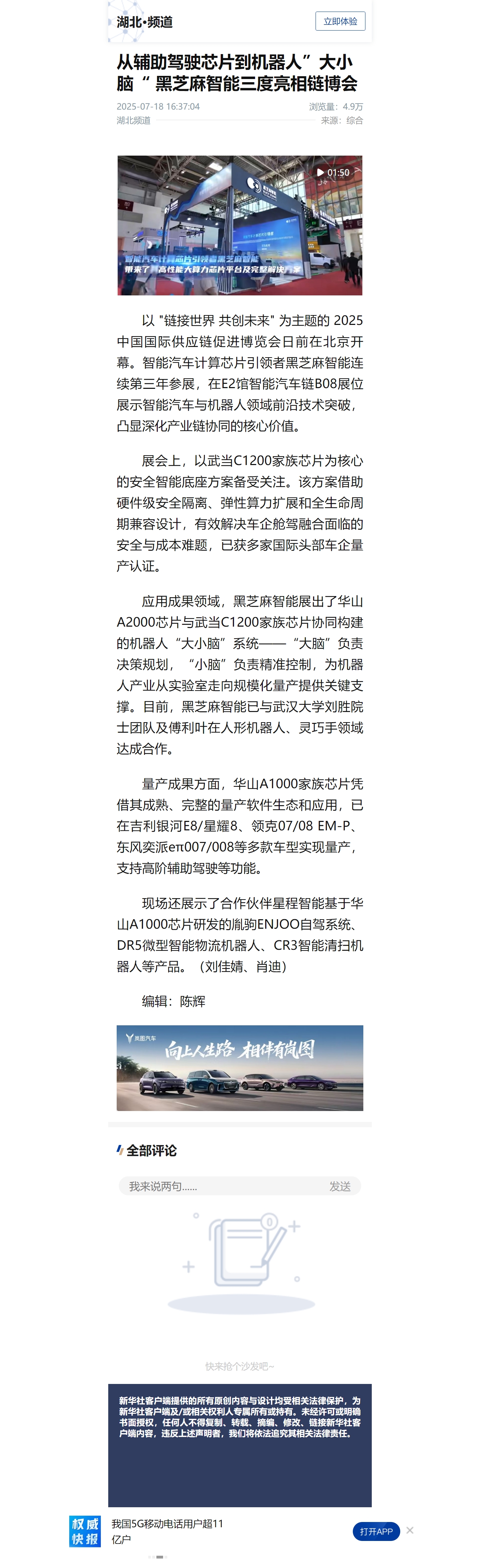 新华社:从辅助驾驶芯片到机器人”大小脑“ 黑芝麻智能三度亮相链博会