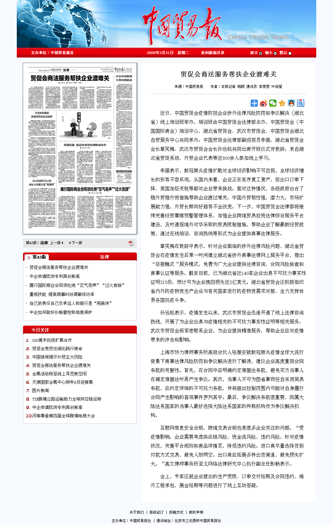 中国贸易报:贸促会商法服务帮扶企业渡难关