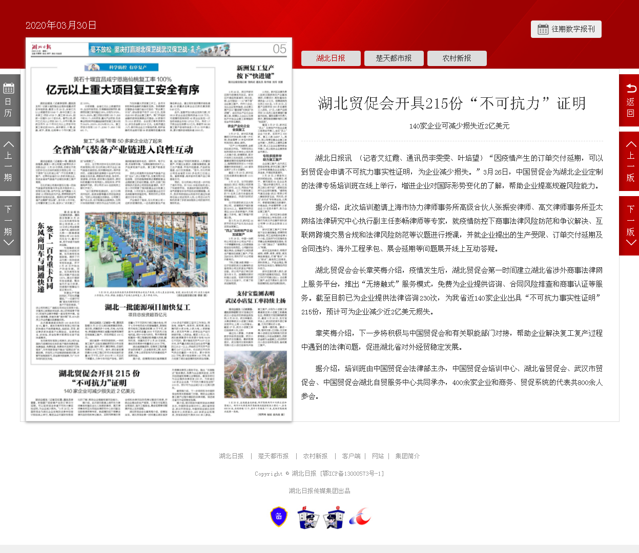 湖北日报:湖北贸促会开具215份“不可抗力”证明