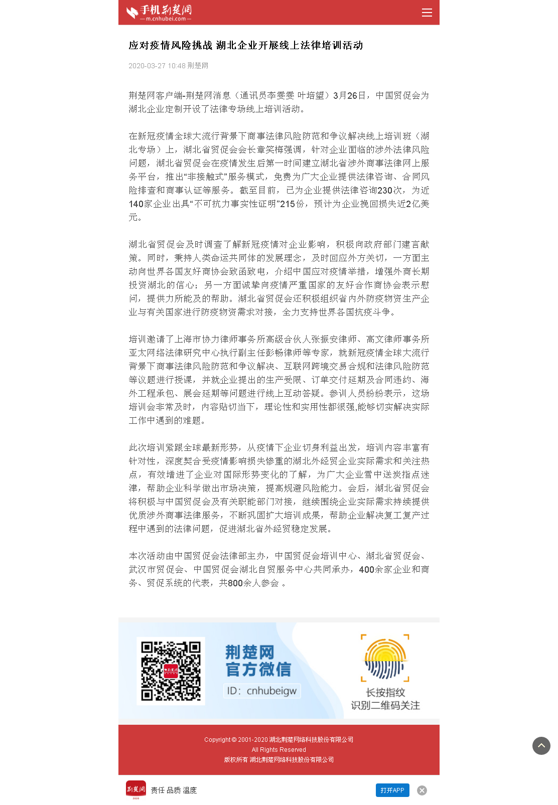 手机荆楚网:应对疫情风险挑战 湖北企业开展线上法律培训活动