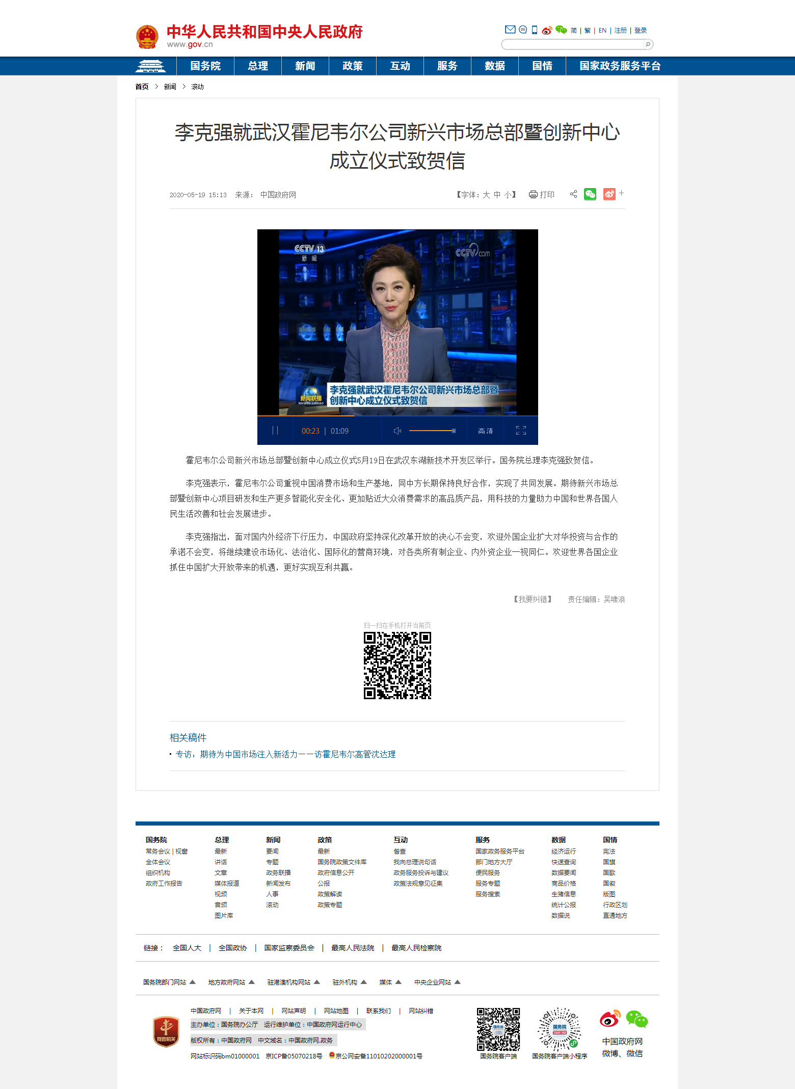 中国政府网:李克强就武汉霍尼韦尔公司新兴市场总部暨创新中心成立仪式致贺信