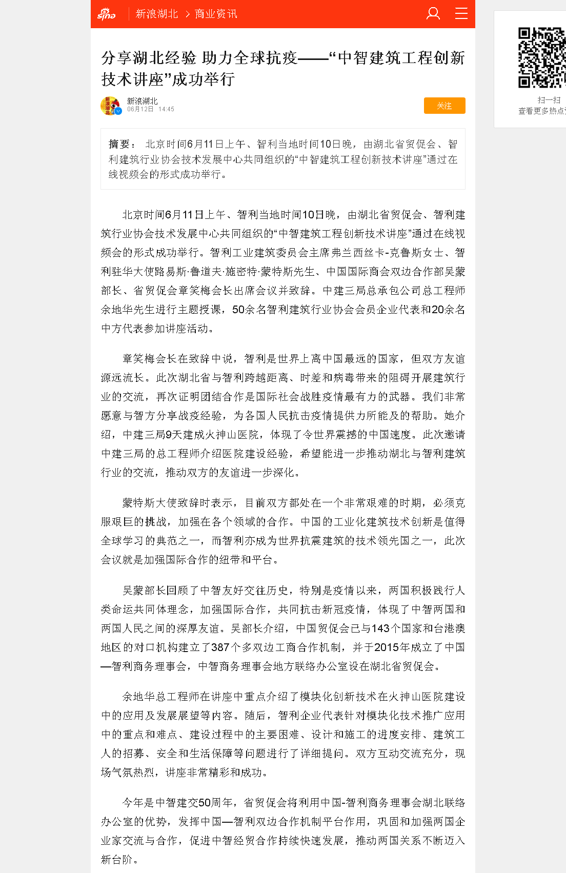 新浪网:分享湖北经验 助力全球抗疫——“中智建筑工程创新技术讲座”成功举行