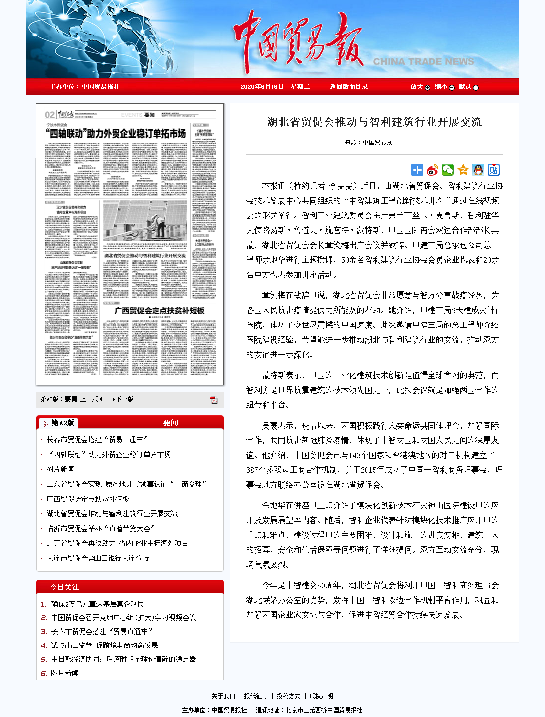 中国贸易报:湖北省贸促会推动与智利建筑行业开展交流