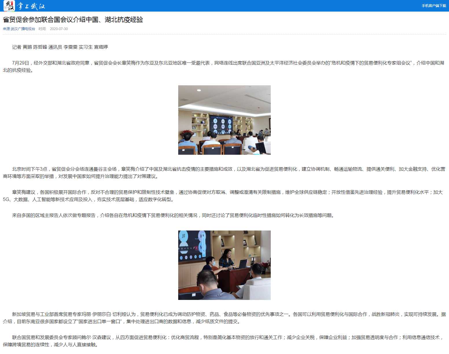 武汉广播电视台:省贸促会参加联合国会议介绍中国、湖北抗疫经验