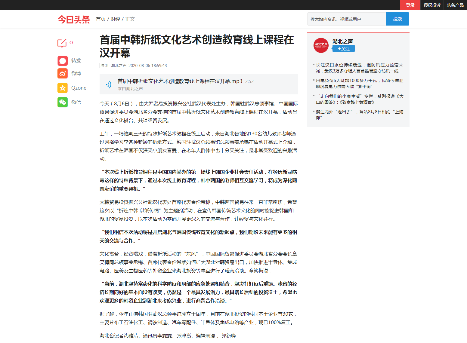 湖北之声:首届中韩折纸文化艺术创造教育线上课程在汉开幕