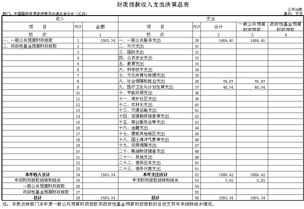 2018年财政拨款支出决算总计1593.34万元,其中:一般公共服务支出1464.40万元,社会保障和就业支出78.97万元,医疗卫生与计划生育支出46.04万元,年末财政拨款结转和结余3.92万元。