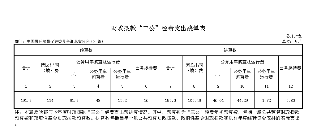(八)三公经费:纳入财政预决算管理的三公经费,是指部门用财政拨款安排的因公出国(境)费、公务接待费和公务用车购置及运行维护费。其中,因公出国(境)费主要用于省政府在香港、欧美等发达国家或地区举办的大型经贸活动和参加商务部在境外举办的各种商品展以及单位工作人员公务出国(境)的住宿费、旅费、伙食补助费、杂费、培训费等支出;公务接待费反映单位按规定开支的各类公务接待(含商务接待)支出;公务用车购置及运行维护费反映单位公务用车购置费及租用费、燃料费、维修费、过路过桥费、保险费、安全奖励费用等支出。