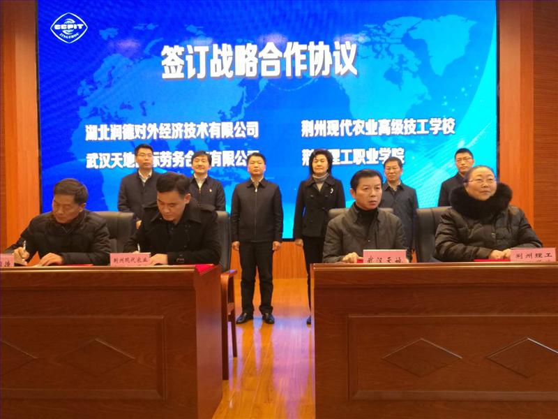 会议上,荆州市副市长向斌和江陵县县长韩旭作了热情洋溢的致辞与讲话,中国人民健康保险公司就医疗救援相关政策进行了宣讲,3家大型对外劳务合作企业作了项目推介,2名外出务工代表进行了体会交流。参会领导为培训基地举行授牌仪式,共同见证培训基地与对外劳务合作企业签订了战略合作协议。