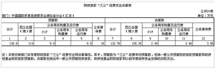 (八)三公经费:纳入财政预决算管理的三公经费,是指部门用财政拨款安排的因公出国(境)费、公务接待费和公务用车购置及运行维护费。其中,因公出国(境)费主要用于省政府在香港、欧美等发达国家或地区举办的大型经贸活动和参加商务部在境外举办的各种商品展以及单位工作人员公务出国(境)的住宿费、旅费、伙食补助费、杂费、培训费等支出;公务接待费反映单位按规定开支的各类公务接待(含商务接待)支出;公务用车购置及运行维护费反映单位公务用车购置费及租用费、燃料费、维修费、过路过桥费、保险费、安全奖励费用等支出。