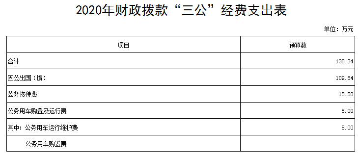 八、“三公”经费:指使用财政拨款安排的因公出国(境)费、公务用车购置及运行费和公务接待费。其中,因公出国(境)费反映我会公务出国(境)的国际旅费、国外城市间交通费、住宿费、伙食费、培训费、公杂费等支出;公务用车购置及运行费反映我会公务用车车辆购置支出(含车辆购置税)及燃料费、维修费、过路过桥费、保险费、安全奖励费用等支出;公务接待费反映我会按规定开支的各类公务接待(含外宾接待)支出。