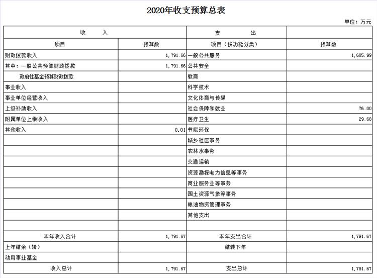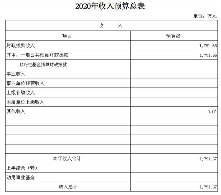 2020年收入预算数1791.67万元,其中:财政拨款收入1791.66万元,其他收入0.01万元。