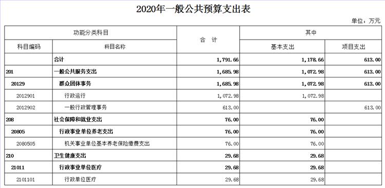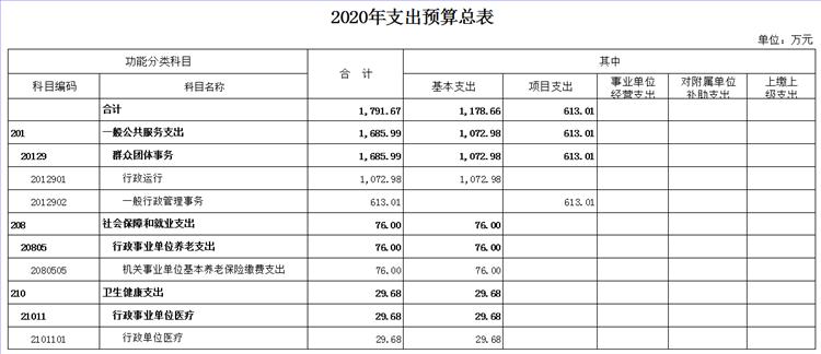 2020年我会一般公共预算支出预算数1791.66万元,其中:基本支出1178.66万元、项目支出613万元。
