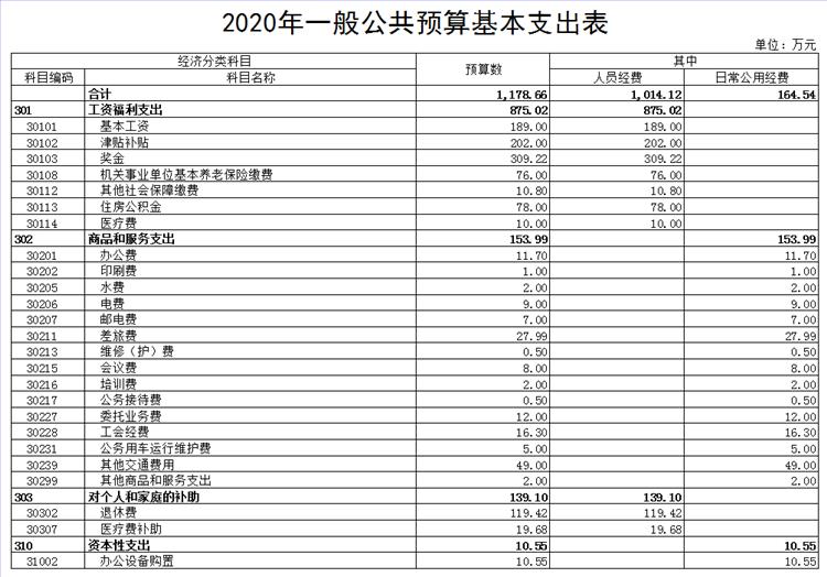 2020年我会一般公共预算基本支出预算数1178.66万元,其中:人员经费1014.12万元,日常公用经费164.54万元。