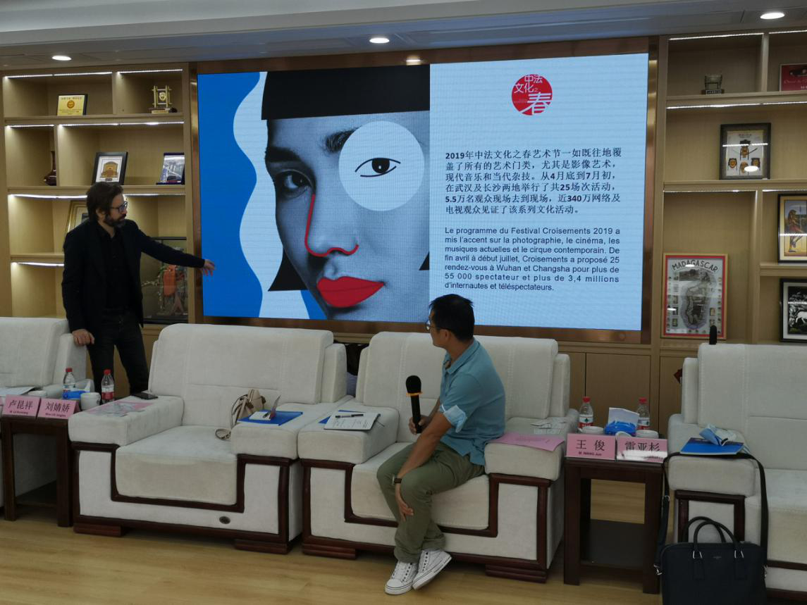 法国驻汉总领馆文化专员雷亚杉先生用PPT全面地展示了法领馆近年来各项精彩纷呈的交流活动及成果,并重点介绍了包括“法语活动月”、“中法文化之春”、“中法环境月”以及“龚古尔文学奖中国评选”的四大文化活动。
