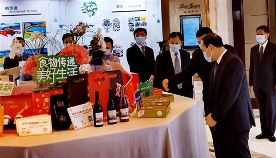 开幕式会场外,我会同期举办了新西兰商品展,集中展示了奇异果、乳制品、蜂蜜、红酒等新西兰特色产品。