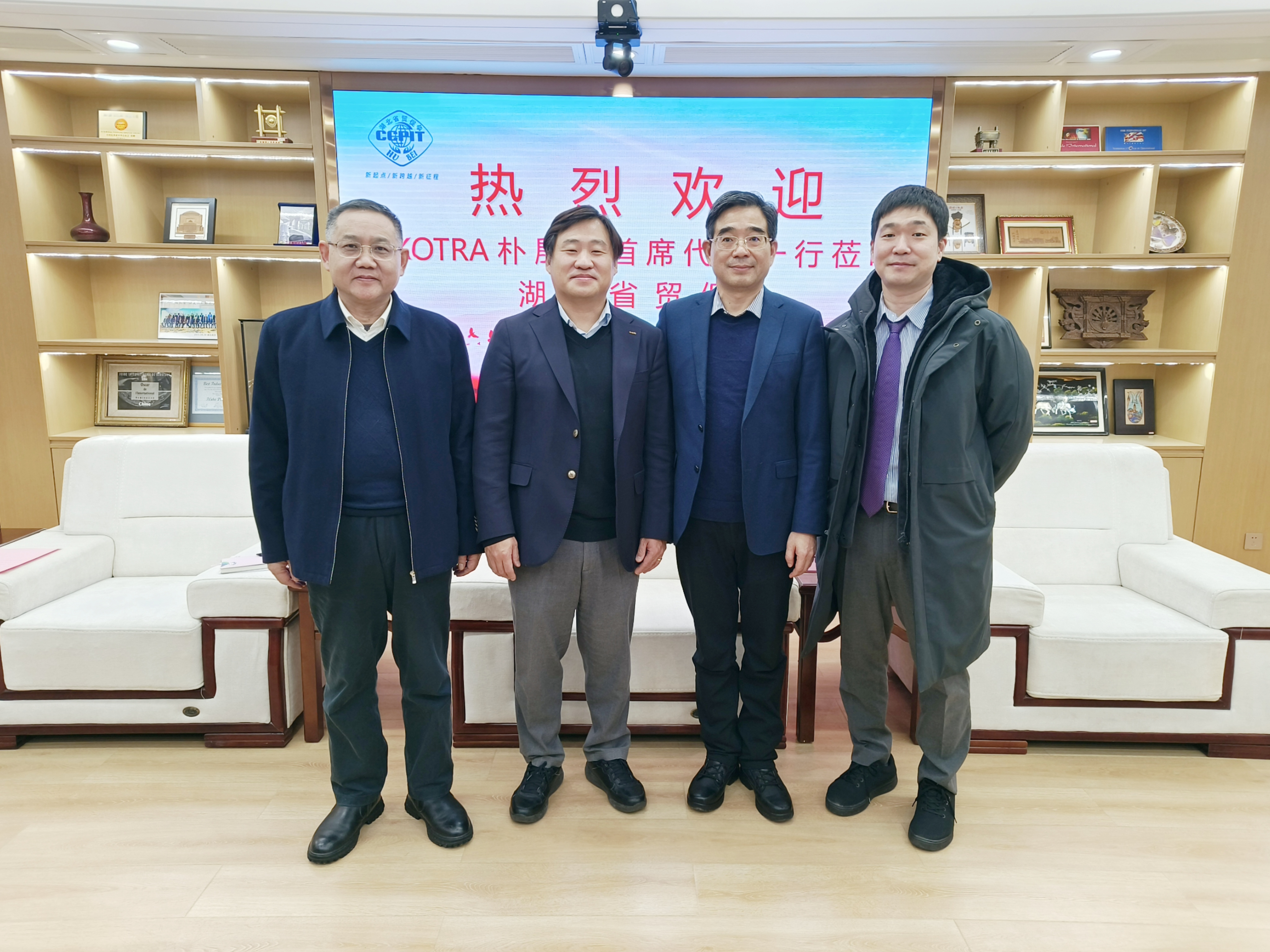 2月5日下午,胡中海主任会见了大韩贸易投资振兴公社武汉代表处(以下简称KOTRA武汉代表处)首席代表朴殷均一行。双方围绕进一步推动鄂韩经贸与投资合作进行了交流。