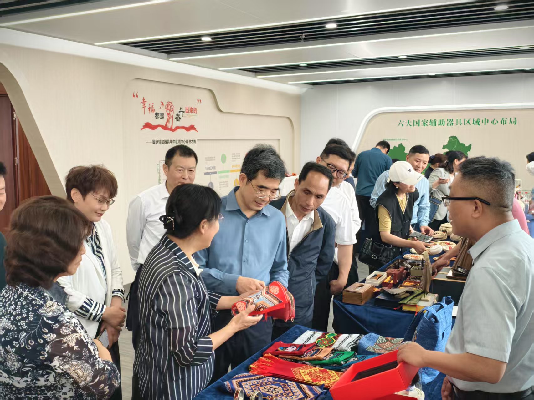 胡中海一行参观了省残联康复园区,与园区工作人员及康复儿童亲切交谈,询问我省残疾人和功能障碍者康复医疗教育工作。认真观看武汉汉绣、百步堂、宜昌沁邑、西兰卡普、利川木雕、玉叶草编、阳新布贴、十堰绿松石、恒达扫帚等市州部分残疾人文创产品,了解残疾人文创企业发展、市场销路、非遗等手工技艺学习传承以及创业就业情况。