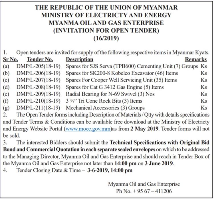 缅甸石油天然气公司采购固井设备、挖掘机、修井机、燃气发动机相关备件,径向轴承、三锥钻头和机械配件等。具体规格、数量等要求请参照图片和招标文件。