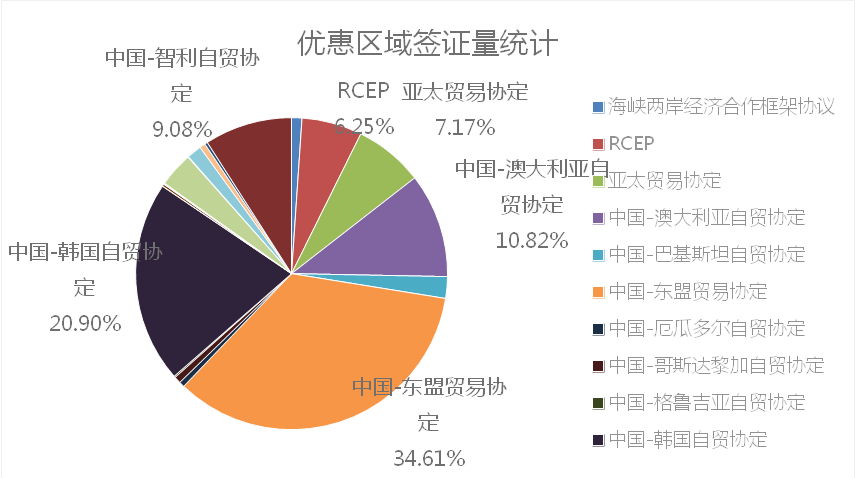 今年一季度湖北省贸促会签证点共签发优惠原产地证4019份,同比上升26.94%,涉及20类区域优惠自贸协定,新增签发5类区域优惠自贸协定项下优惠原产地证,分别是中国-厄瓜多尔自贸协定、中国洪都拉斯自贸协定、中国-马尔代夫自贸协定、中国-毛里求斯自贸协定、中国-塞尔维亚自贸协定。其中,中国-塞尔维亚自贸协定24份,中国-厄瓜多尔自贸协定23份。今年一季度区域优惠原产地证签证量位居前五位的分别是中国—东盟、中国—韩国、中国—澳大利亚、中国-智利和亚太贸易协定,五个优惠区域累计签证量占总签证量的82.58%,各优惠区域签证量占比见下图: