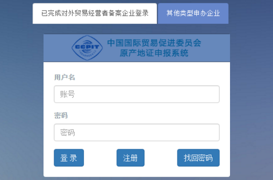 企业完成对外贸易经营者备案后,登录贸促会原产地证书申报系统http://qiye.ccpiteco.net