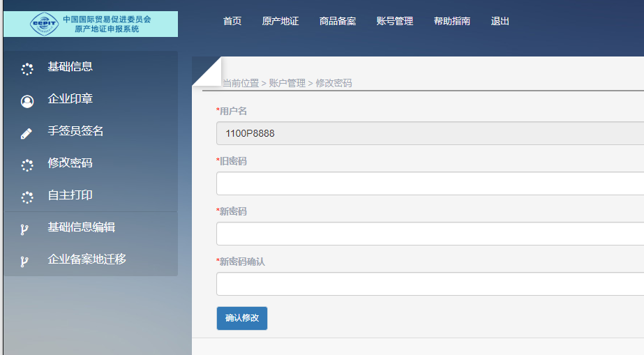 点击“企业印章”,按界面提示与要求上传本企业印章电子图片,若未按要求上传印章图片,企业到贸促会领取原产地证书时需携带印章并在现场加盖。
