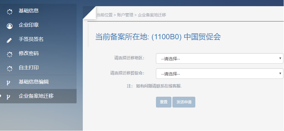 企业选择要迁移的地区和贸促会,点击发送按钮发送申请。