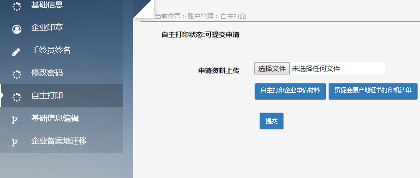 企业如申请贸促会原产地证书自主打印服务,可点击“自主打印申请”,查看“自主打印企业申请材料”和“贸促会原产地证书打印机清单”后,按要求上传申请资料,提交后等待贸促会审核。