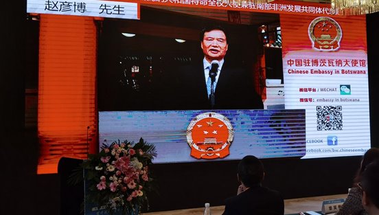 Chinese Ambassador to Botswana and Representative to Southern African Development Community, Mr. Zhao Yanbo delivers a speech via video.