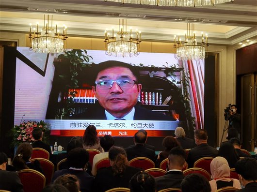 Former ambassador to Ireland, Jordan and Qatar, Director of Center for World Studies, National Academy of Development and Strategy, Renmin University of China, Mr. Yue Xiaoyong delivers a speech via video.