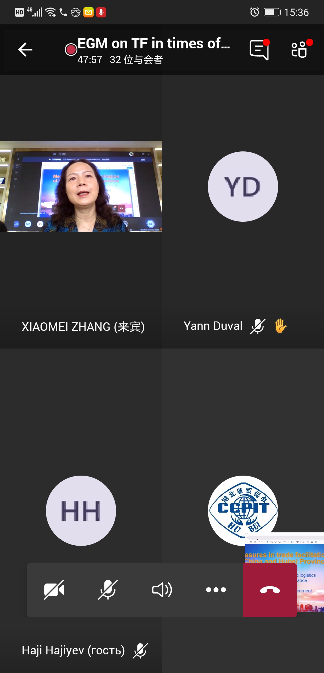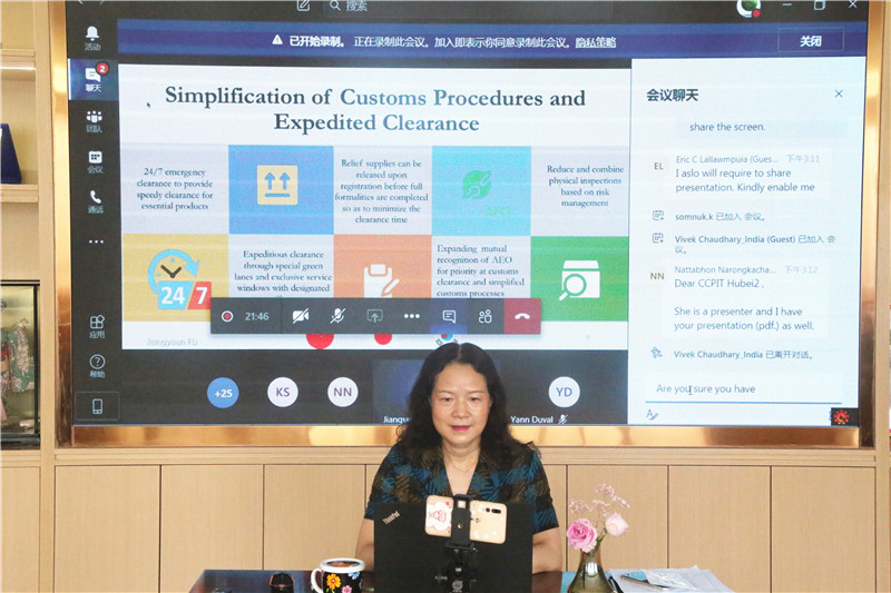 To review good practices in trade facilitation implemented by Asian and the Pacific countries in response to COVID-19, enhance resilience on global value chain and help developing countries with capacity building, ESCAP has organized its first Expert Group Meeting on Trade Facilitation in Times of Crisis and Epidemic (Virtual Meeting) from July 29 to July 30. President Zhang Xiaomei of China Council for the Promotion of International Trade, Hubei Sub-council was invited to the meeting as the only guest in East and Northeast Asia and shared experiences of China and Hubei Province in trade facilitation.