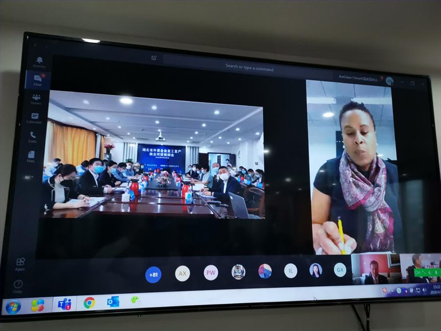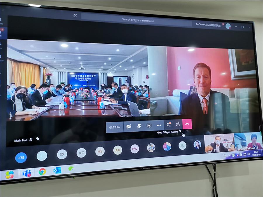 On April 30, CCPIT Hubeiand AmChamChinaco-hosted a video conference for a dialogue between government andforeign-funded enterprises to help business address difficulties in workresumption. Mr. Zhao Haishan, Vice Governor of Hubei Province attended thedialogue and delivered remarks. Mr. Liu Zhongchu, Deputy Secretary-General ofHubeiprovincialgovernment chaired the meeting. Ms. Cynthia A. Griffin, Minister Counselor forCommercial Affairs, US Embassy in Beijing, Mr. Greg Gilligan, Chairman ofAmCham China and Mr. Alan Beebe, President of AmCham China joined the talks andexpressed attention and support to Hubei’s efforts in fighting COVID-19 andpost-pandemic recovery as well as full confidence and expectations for Hubeisdevelopment and further cooperation. Heads of Wuhan Municipal Government andnearly 20 departments at provincial and municipal levels, along with over 100representatives from 69 foreign-funded enterprises participated in the event.