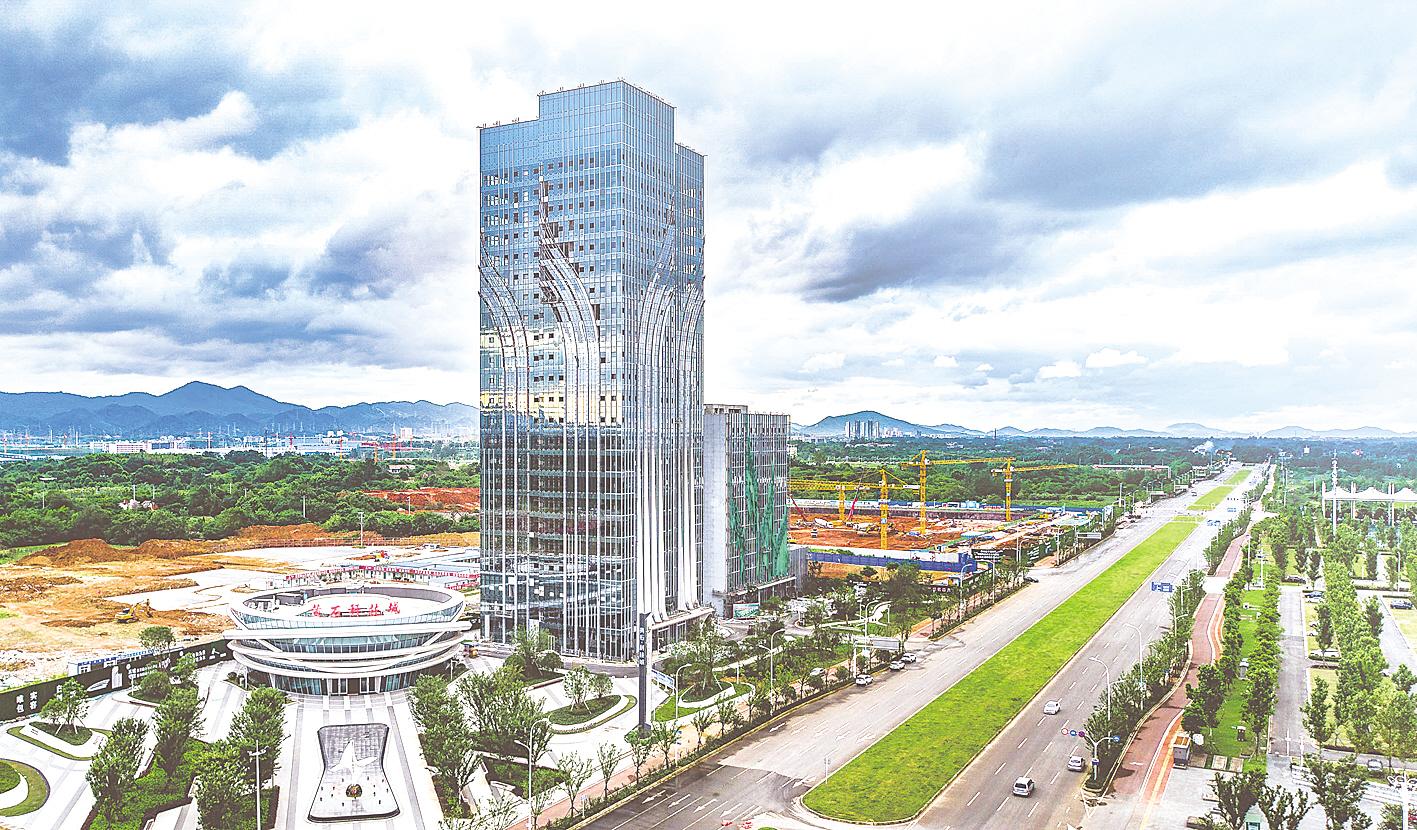 Aerial photo taken on July 28, shows the being-built sci-tech innovation center of Huangshi sci-tech city, in Huangshi City, Hubei Province. As the fulcrum of Huangshi City to connect with the Optics Valley sci-tech innovation corridor, the Huangshi sci-tech city covers an area of about 1,700 mu with a total investment of 6.5 billion to 10 billion yuan. It will be home to such five major functions as application research and development, achievement transformation, entrepreneurial incubation, talent cultivation, and industry demonstration after completion. At present, construction of the projects’ first phase has entered the final stage and the second phase project has been fully launched. (Photo by Xue Ting/ Hubei Daily)