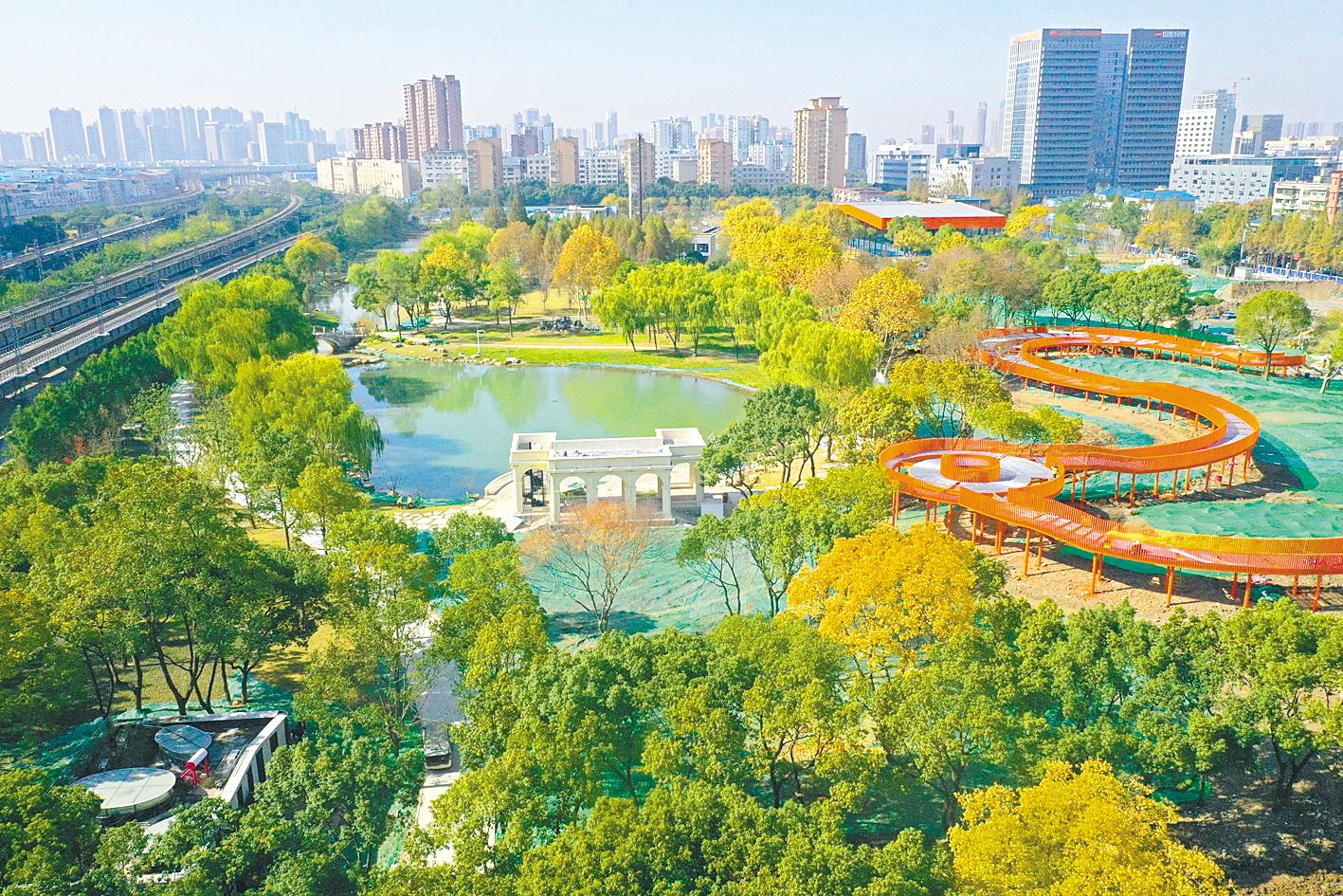 Photo taken on Nov. 16, shows the aerial view of Changqing Park in Jianghan District, Wuhan City. Covering a land of 200,000 square meters, it is the first park supported by 5G network in Wuhan. 5G technology and smart hardware that could be spotted around the 20,000-square-meter wetland, playgrounds, gyms and footpaths in the park are expected to well-serve the visitors after the park opens in December. (Photo by Xiong Ying & Cui Zhenkun for Hubei Daily)