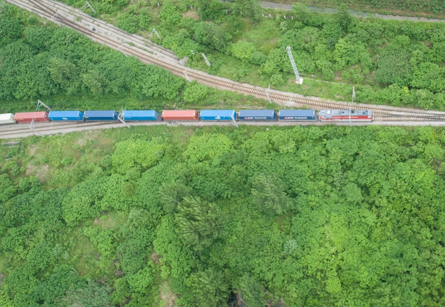 Aerial photo shows a China-Europe freight train departing from Wujiashan railway container center station in Wuhan, central China's Hubei Province, May 9, 2020. (Xinhua/Xiao Yijiu)